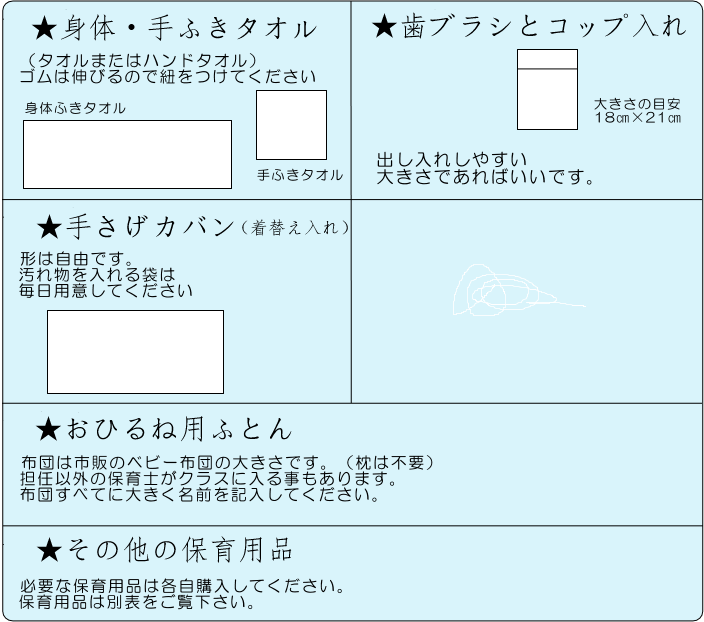 *保育用品にお名前を記入して下さい。