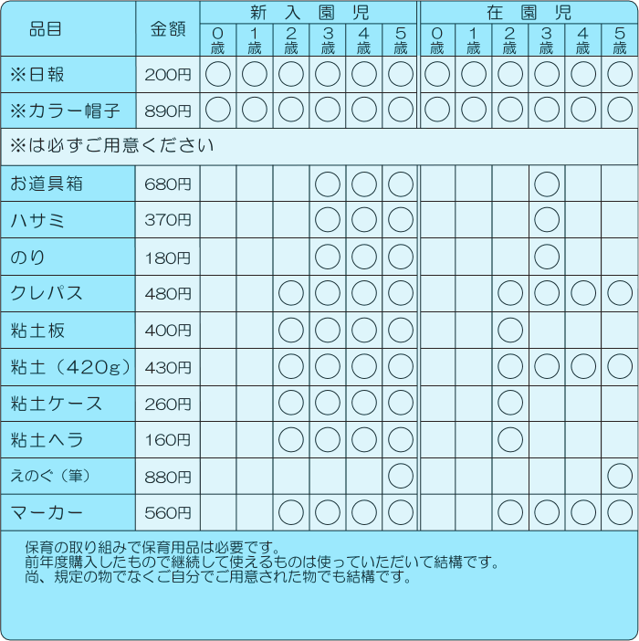 年度により保育用品の値段に変更があります。